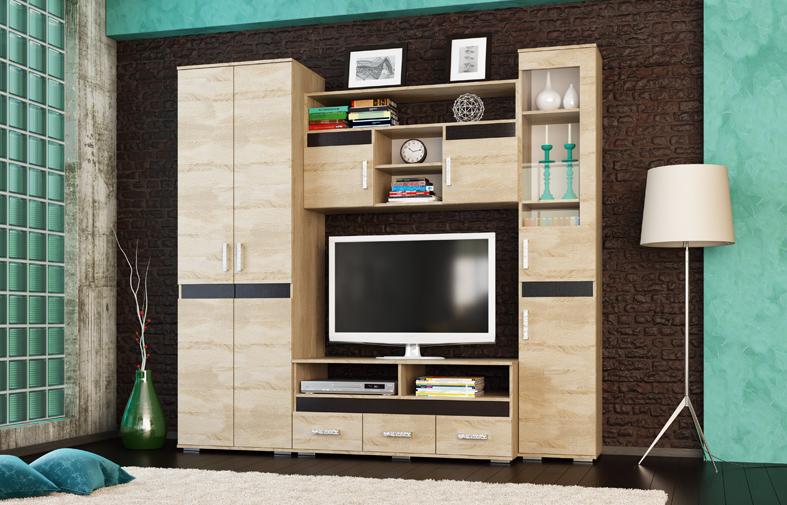 Под прямоугольной столешницей расположены три вместительных выдвижных ящика. Мебель выполнена в тёплой цветовой гамме, сочетающей цвет дуба с темными вставками. Стенка эргономично впишется в любой интерьер.