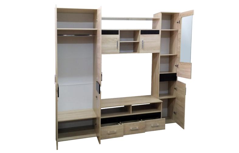 Стенка «Канго» – многофункциональный предмет обстановки с эстетичным дизайном. Включает две вместительные боковые секции: одна из них предназначена для размещения одежды на плечиках, вторая оснащена четырьмя полками. Секция с полками оснащается встроенным стеклом в створке, что позволит открыть вид на предметы в шкафу. В центральной части предусмотрена объёмная ниша под ТВ-аппаратуру, вокруг которой – несколько открытых и закрытых полок.