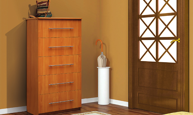 Классический вместительный комод  послужит   отличным дополнением в интерьере вашей гостиной, спальни или прихожей. Комод состоит из пяти выдвигающихся ящиков с железными ручками.  Комод  производится из экологически чистых материалов (ЛДСП / МДФ / Металл / ПВХ / ДВП).