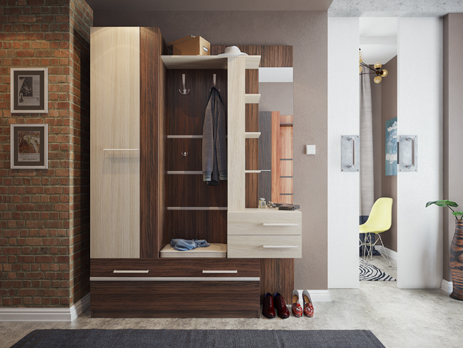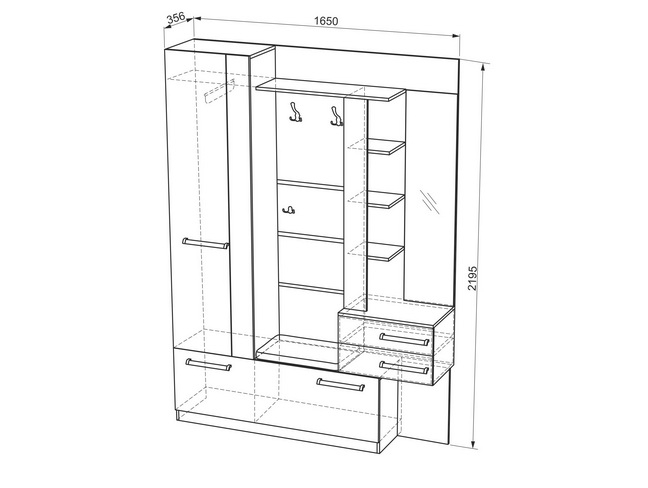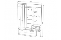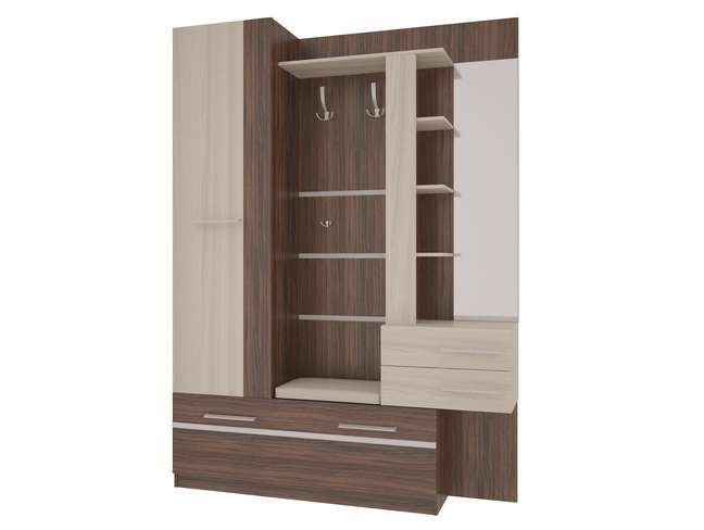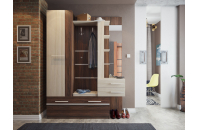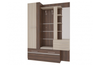 Состоит из: шкафа с выдвижной штангой, вешалки с крючками для одежды и сумок, шкафа для обуви, открытых полок, зеркала, полки для головных уборов, выдвижных ящиков, мягкого сидения.