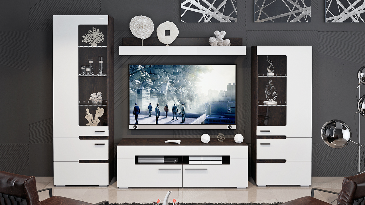 Модульная гостиная Фьюжн — стильная современная белоснежная композиция с декоративными вырезами на фасадах.Гостиная Фьюжн поможет правильно организовать ваше жилое пространство и создаст стильный интерьер в вашем доме. Элементы могут комбинироваться друг с другом в разнообразных сочетаниях, при этом выглядя эффектно не только вместе, но и тдельно. Разноуровневая конструкция делает комнату визуально более легкой. Гарнитур сочетает в себе интересную фактуру дерева, экстра-белый цвет фасадов и вставки из стекла. Каждый элемент органично гармонирует друг с другом. Светлый глянец делает комнату более светлой и просторной. Темный блеск стекла придаст брутальности и загадочности.