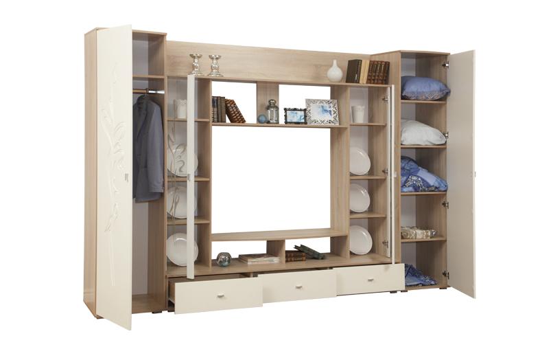 Большая вместительная стенка 'Лаванда-1', имеющая три выдвижных ящика и четыре отделения, оснащённых распашными дверцами. Светлые фасады самых больших отделов, расположенных по бокам, украшаются замысловатым рисунком. Рядом с ними предусмотрены отделы с деревянными полками, закрывающиеся распашными дверцами со вставками из стекла. Верхняя центральная часть шкафа оборудована двумя вместительными полками, на которых можно хранить сувениры, посуду и другие предметы. Также в центре шкафа предусмотрена ниша для ТВ-аппаратуры.