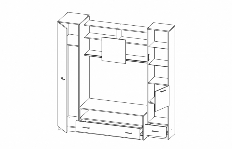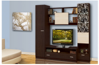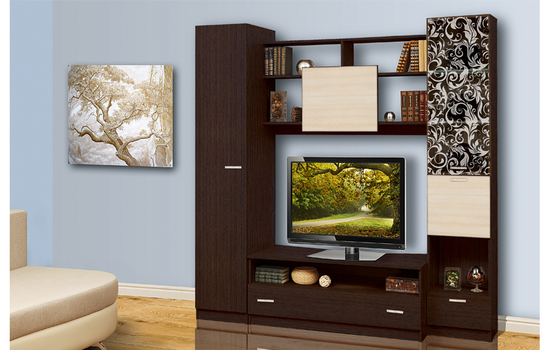 Стенка «Магна-2» – красивый комплект, оформленный в стиле прованс. Он включает высокий шкаф для одежды с глухой створкой, тумбу под TV с глубокой открытой нишей и выдвижным ящиком, а также навесную полку и комбинированный шкаф. Последний имеет небольшой выдвижной ящик для мелочей, открытую секцию, отдел с глухой откидной створкой и несколько полок вверху, закрытых стеклянной дверцей с дизайнерским рисунком. Модель устанавливается на прочный цоколь.