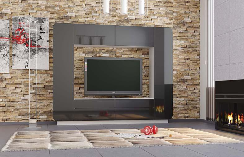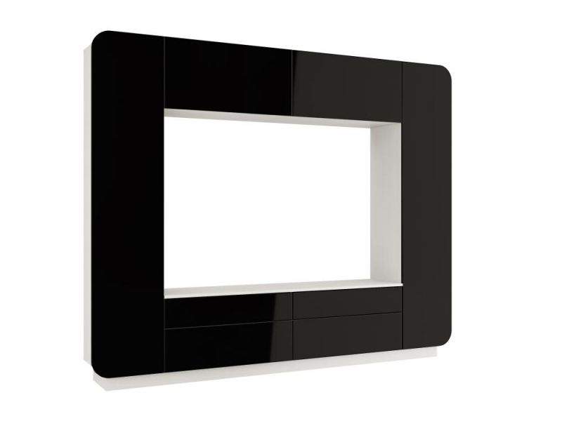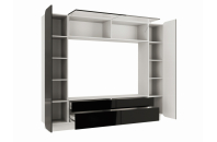 Внизу имеется четыре вместительных выдвижных ящика (комплектуются шариковыми направляющими) и два больших отделения вверху (комплектуются газлифтами) В каждой боковой секции по пять полок. Все дверцы, кроме верхних оснащены толкателями. Цветовые решения в белом и черном глянце придают стенке отличный внешний вид, подходящий для любого оттенка интерьера.