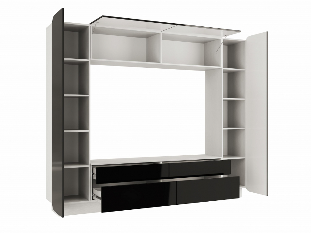 Внизу имеется четыре вместительных выдвижных ящика (комплектуются шариковыми направляющими) и два больших отделения вверху (комплектуются газлифтами) В каждой боковой секции по пять полок. Все дверцы, кроме верхних оснащены толкателями. Цветовые решения в белом и черном глянце придают стенке отличный внешний вид, подходящий для любого оттенка интерьера.