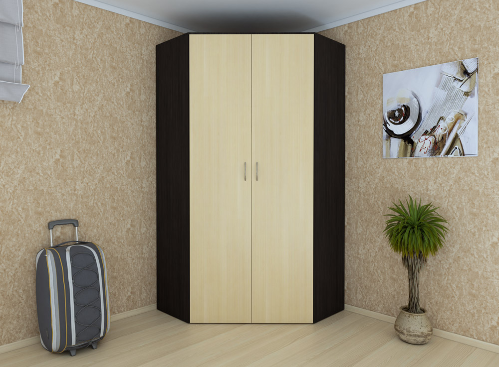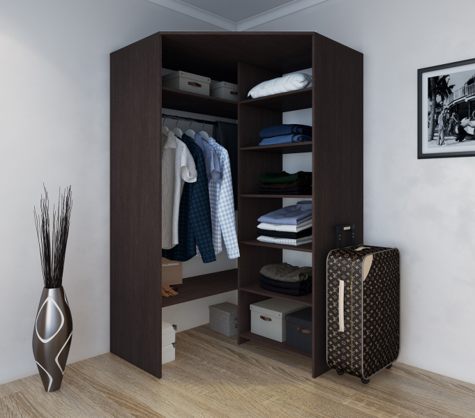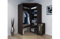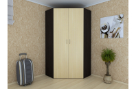 Двери углового шкафа – распашные. Оснащение изделия предусматривает полки для одежды и обуви, вертикальные отсеки со штангами для верхней одежды. Шкаф удобный и комфортный в использовании.