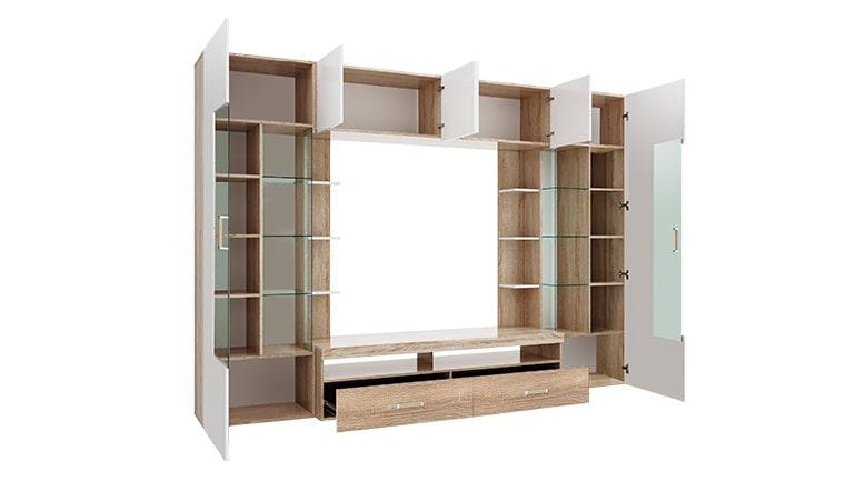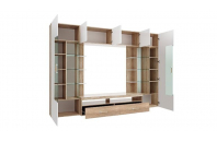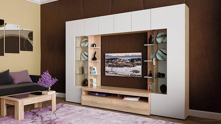 «Лаванда-3» - красивая стенка в цвете «белый глянец», за счет чего впишется в любой цветовой интерьер. Сверху расположены четыре вместительных отсека по бокам множество открытых и закрытых полок. Внизу тумба под тв,с удобным открытым местом для видеоаппаратуры и журналов и два выдвижных ящика.
