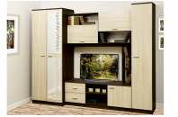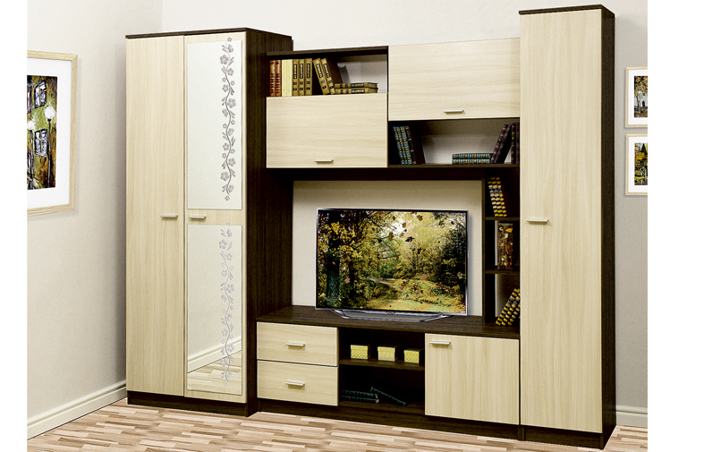 Стенка "Глория-6" для гостиной комнаты, состоящий из большого двустворчатого шкафа, тумбы под TV, шкафа-пенала и многочисленных отделов. Тумба под TV имеет два выдвижных ящика, секцию с распашной дверцей и две центральные ниши. Верхняя часть оборудована двумя отделами с откидными створками и полками. В центре имеется вместительная ниша, в которую легко входит большой плазменный телевизор. Крупногабаритный шкаф украшен двумя прямоугольными зеркалами с интересным пескоструйным рисунком.