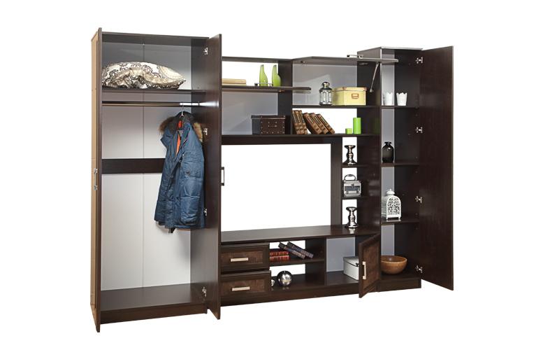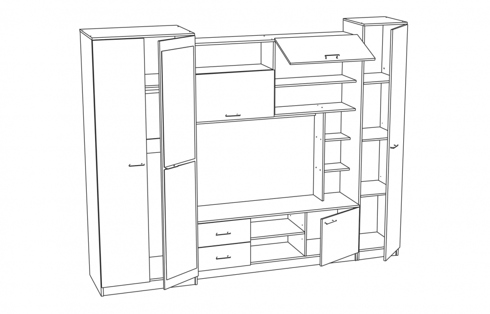 Стенка "Глория-6" для гостиной комнаты, состоящий из большого двустворчатого шкафа, тумбы под TV, шкафа-пенала и многочисленных отделов. Тумба под TV имеет два выдвижных ящика, секцию с распашной дверцей и две центральные ниши. Верхняя часть оборудована двумя отделами с откидными створками и полками. В центре имеется вместительная ниша, в которую легко входит большой плазменный телевизор. Крупногабаритный шкаф украшен двумя прямоугольными зеркалами с интересным пескоструйным рисунком.