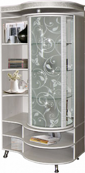 Стильный и элегантный шкаф с витриной Л Орфей-12 (витрина расположена слева) станет изюминкой и функциональным предметом мебели в современном интерьере Вашей гостиной.Шкаф, с оригинальными гнутыми остекленными фасадами оформлен: полукруглой  остекленной витриной с витражами и восьмью открытыми полками. Рисунки, нанесенные на остекление, подчеркивают новизну и изящность дизайнерских решений. Шикарный шкаф с витриной Орфей-12 выглядит ярко, роскошно и внесет в интерьер гостиной элегантность, гармоничность, особую индивидуальность и комфорт.