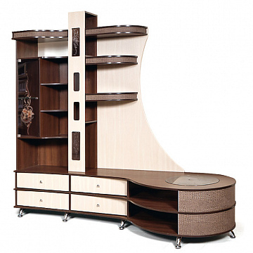 Оригинальный, изысканного дизайна, шкаф Орфей-12 комбинированный с тумбой (правое расположение тумбы), выполненный с закругленным оформлением фасада, придаст Вашей гостиной особую индивидуальность и комфорт.Шкаф представлен единым модулем и включает: четыре выдвижных ящика, остекленные витрины со стеклянными полками, открытые полки и ниши разных размеров на разных уровнях, вместительную нишу под телевизор. Материал изготовления: корпус – ЛДСП, фасад – ЛДСП, стекло. Стекла изделия закалены, что обеспечит долговечность и безопасность. Комбинированный шкаф Орфей-12 - модный, практичный и стильный предмет мебели в современном интерьере, который подчеркивают изящность дизайнерских решений.