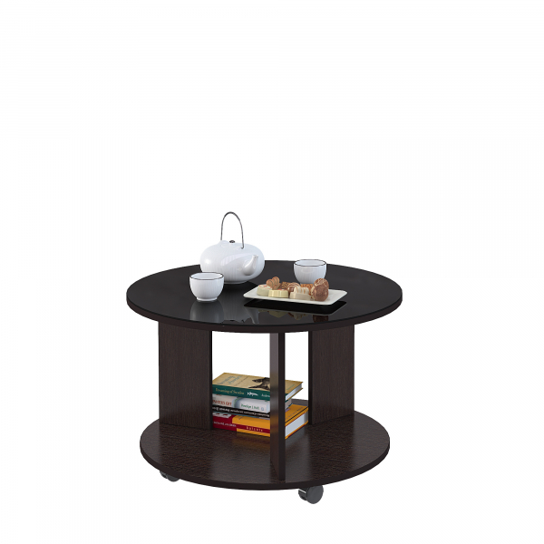 Журнальный стол на колесиках очень многофункционален. Четыре пластиковых колесика позволяет быстро убирать столик что бы разложить диван или использовать его в качестве сервировочного столика. Стол выдерживает большие распределенные нагрузки. Круглый стол хорошо сочетается как с классической, так и с современной мебелью. Кроме того он не имеет острых углов и полностью безопасен для детей.