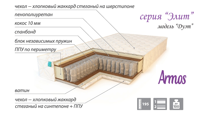 Ортопедический матрас «Дуэт» серии Элит компании Armos (Армос) изготовлен на основе независимого пружинного блока TFK. Пружины блока TFK работают независимо друг, от друга. Подстраиваясь под форму Вашего тела, они создают ортопедический эффект. Модель «Дуэт» это матрас с различной жесткостью сторон. Одна сторона матраса мягкая, вторая сторона - более жесткая. Спать Вы можете на любой из сторон. Для зимы больше подходит мягкая сторона матраса, так как она точно подстраивается под контуры тела и сохраняет тепло. Летом комфортней будет спать на жесткой стороне, она менее плотно прилегает к телу и обеспечивает циркуляцию воздуха, это дает ощущение прохлады. Жесткая сторона матраса состоит из блока кокосовой койры и ватина. Именно кокос придает поверхности матраса необходимую жесткость и упругость. Мягкость второй стороны обеспечивает пенополиуретановый блок, лежащий на слое кокосовой койры. От пружинного блока кокосовые блоки отделены спанбондом. Ортопедический матрас «Дуэт» усилен по периметру пенополиуретановыми бортами и способен выдерживать нагрузку до 100 кг на спальное место.