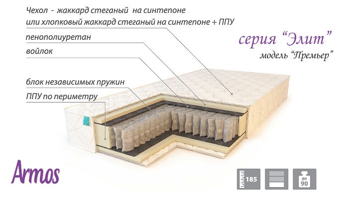 Ортопедический матрас «Премьер» серии Элит от компании Armos (Армос) изготовлен на основе независимого пружинного блока TFK. Пружины блока TFK работают независимо друг, от друга подстраиваясь под форму Вашего тела, обеспечивая тем самым ортопедический эффект. На обеих сторонах матраса находятся мягкие пенополиуретановые плиты, отделенные от независимого пружинного блока прослойкой войлока. По периметру матрас «Премьер» усилен пенополиуретановыми бортами. Данный матрас рекомендован людям со средней массой тела. Выпускается ортопедический матрас «Премьер» в двух исполнениях: с чехлом из стеганого на синтепоне жаккарда или хлопкового жаккарда стеганого на синтепоне с ППУ.