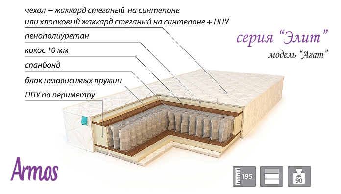 Ортопедический матрас «Агат» серии Элит от компании Armos (Армос) изготовлен на основе пружинного блока TFK. Пружинный блок TFK является независимым блоком – это означает, что его пружины работают независимо друг, от друга подстраиваясь под форму Вашего тела, этим и обеспечивается ортопедический эффект. На обеих сторонах матраса находятся мягкие пенополиуретановые плиты и блоки кокосовой койры. Кокосовая койра повышает жесткость и упругость, а пенополиуретан придает мягкость поверхности матраса. Ортопедический матрас «Агат» по периметру усилен пенополиуретановыми бортами. Этот матрас подойдет людям со средней массой тела. Выпускается матрас «Агат» в двух исполнениях: с чехлом из стеганого на синтепоне жаккарда или хлопкового жаккарда стеганого на синтепоне с ППУ.