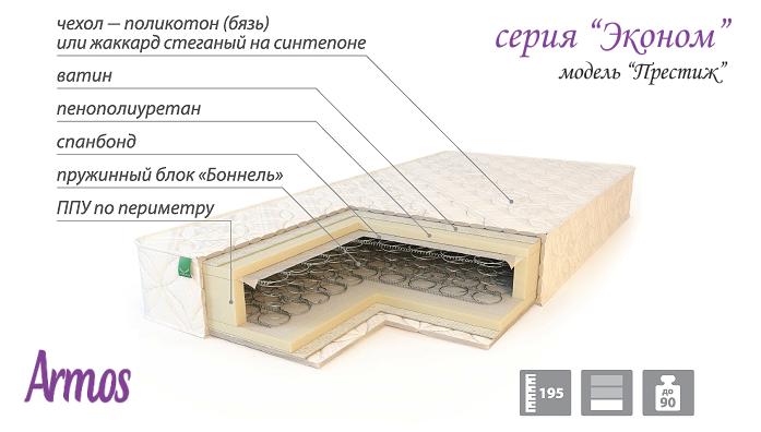 Матрас «Престиж» серии Эконом от Armos (Армос) изготовлен на основе зависимого пружинного блока Бонель (Bonnell). Мягкие пенополиуретановые плиты отделены от пружинного блока сапнбондовой прослойкой. Между чехлом матраса и полиуретаном находится войлок, предающий матрасу дополнительную мягкость. Матрас «Престиж» по конструкции близок к модели «Классик», однако борта его усилены пенополиуретаном и несущая способность у него выше и составляет 90 кг на спальное место.