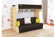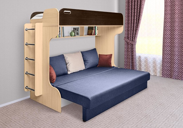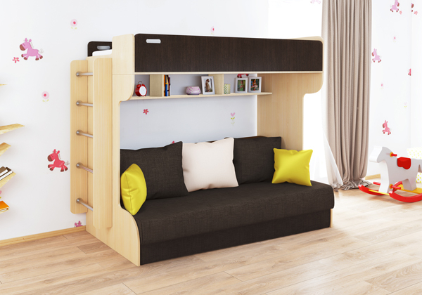 Второй ярус лучше отдать старшему по возрасту ребенку. Взобраться наверх можно по лесенке, которая устанавливается сбоку. Она надежная и прочная, монтируется на любую сторону. Для полной безопасности кровать оснащается специальными бортиками, которые не дадут Вашему чаду упасть во время сна. Нижнее спальное место (раскладной диван-кровать), отдайте ребенку помладше.