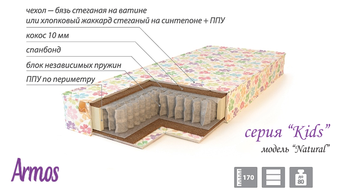 Детский ортопедический матрас «Natural» серии Kids от компании Armos (Армос) основой матраса является независимый пружинный блок TFK. Пружины блока TFK не имеют жесткого соединения, поэтому работают независимо друг, от друга обеспечивая ортопедический эффект. С обеих сторон матраса расположены плиты кокосовой койры, отделенные от пружинного блока прослойкой спанбонда. Кокосовая койра это натуральный материал, обладающий упругостью и оптимальной жесткостью. Ортопедический матрас «Natural» обеспечивает идеальную поддержку и правильное развитие детского организма. Борта матраса усилены полиуретаном, что придает дополнительную жесткость.