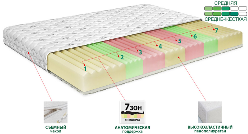 - Пенополиуретан обеспечивает точечную упругость и поддержку тела, соответствующую нагрузке.