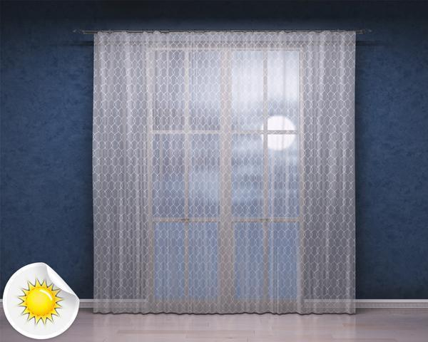 Роскошный тюль кремового цвета украшен геометрическим узором, который добавляет интерьеру изысканности и презентабельности. Такой тюль может использоваться, как самостоятельный декоративный аксессуар при оформлении окна. Тюль легко драпируется, и создает неповторимую атмосферу в комнате.
