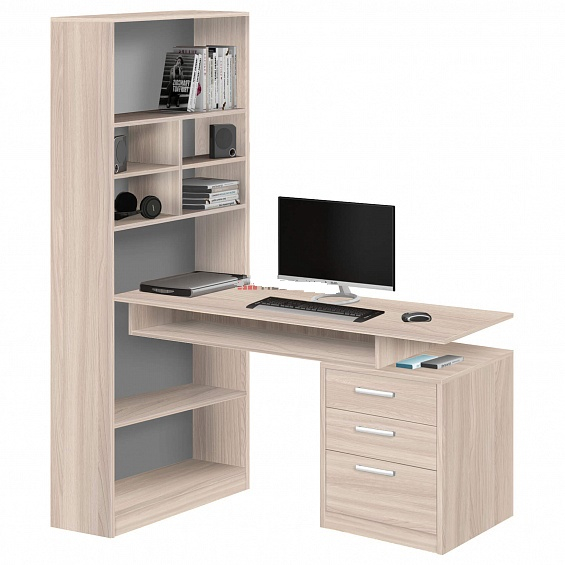 Компьютерный стол со стеллажом будет уместен как в офисе, так и в комнате школьника. Вместительный и функциональный стол выполнен в современном стиле. Стол дополнен стеллажом с открытыми полками. Стильный компьютерный стол станет Вашим любимым местом работы.