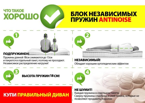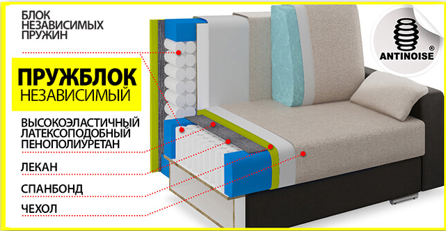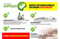 Оптимальный уровень комфорта представленной модели диван-кровати обеспечивается как внешним дизайном, так и внутренним наполнением. Это и материал для обивки, и мягкий наполнитель, и блок независимых пружин ANTINOISE.