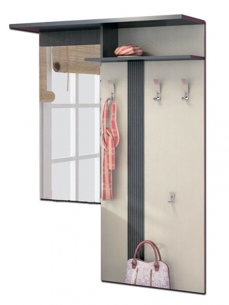 Удобная и функциональная настенная вешалка имеет простой и стильный дизайн. Изготовлена из ламинированной ДСП толщиной 16 мм. Вешалка оборудована зеркалом, тремя 2-х рожковыми металлическими крючками для одежды и крючком для сумок. Вешалка декорирована вставкой из МДФ контрастного цвета. Наверху расположена полка для головных уборов. Над вешалкой и зеркалом установлен декоративный козырек.| Код товара: | 854 |