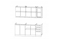 Глубина нижних модулей 600 мм по столешнице,  высота 850 мм.Глубина верхних модулей 300 мм, высота 720 мм.
