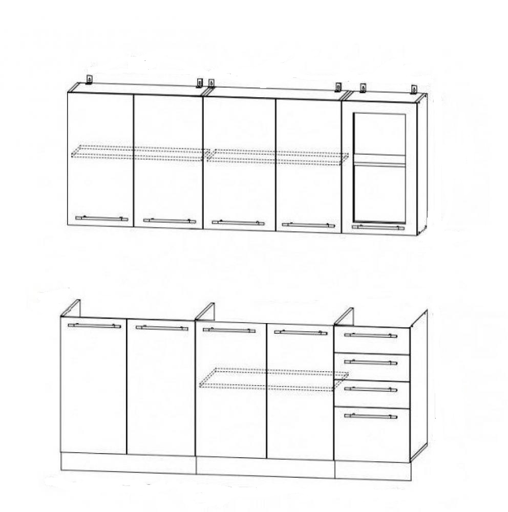 Глубина нижних модулей 600 мм по столешнице,  высота 850 мм.Глубина верхних модулей 300 мм, высота 720 мм.