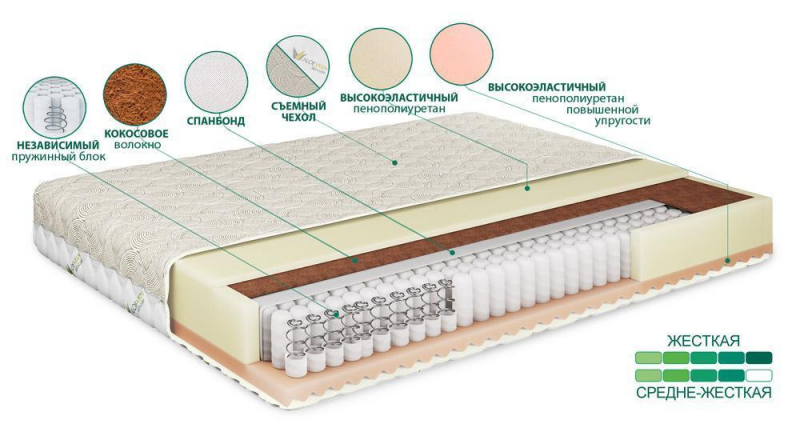 Матрас двусторонний. Одна сторона жесткая, вторая - средне-жесткая. Высота около 24 см. Допустимая постоянная нагрузка на одно спальное место 180 кг.Основные достоинства модели