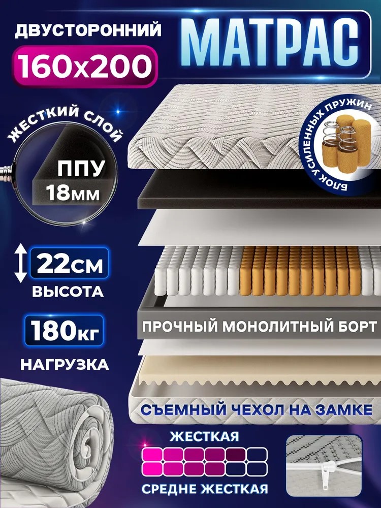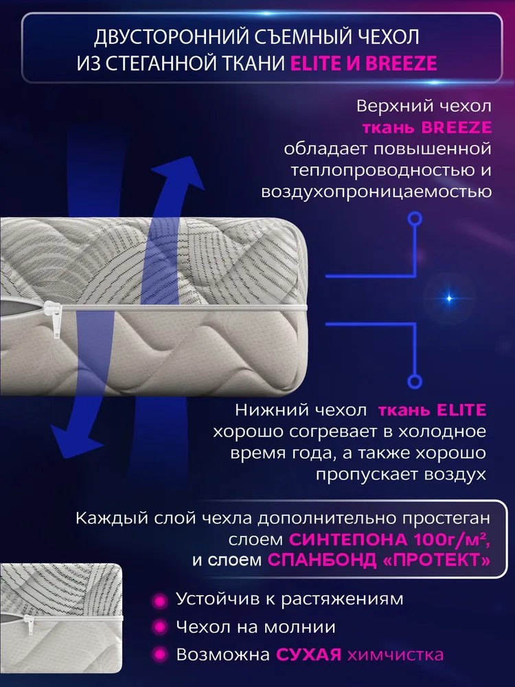 Съемный двухсторонний чехол матраса на молнии с массажным эффектом можно подвергать сухой химчистке. Высота 22 см.