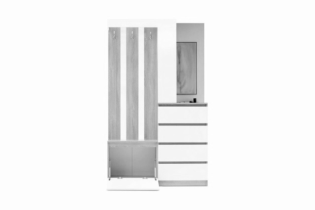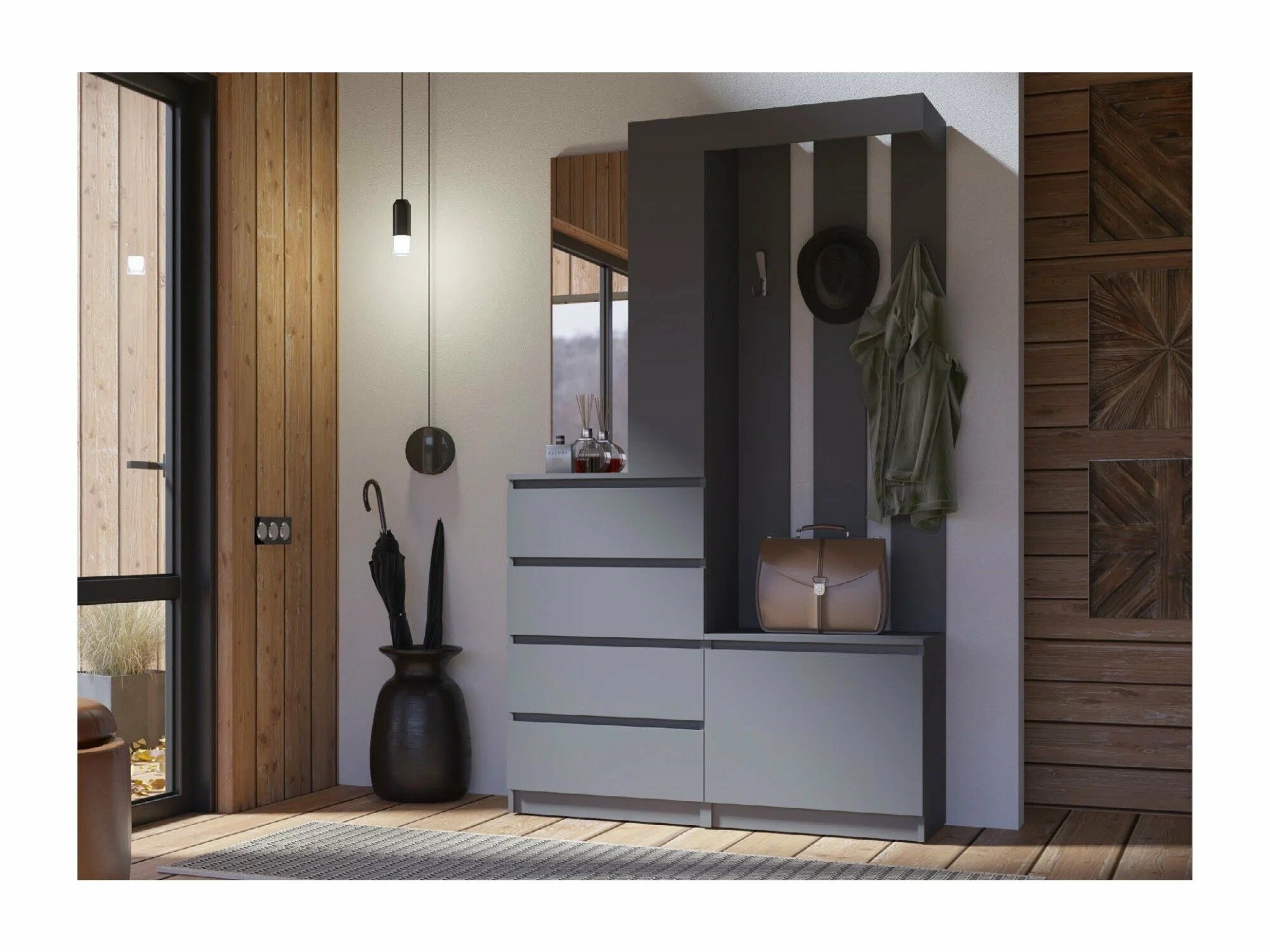 Челси Прихожая — единый модуль с функциональным наполнением. Прихожая оборудована вешалкой с крючками, обувницей с откидной дверью, зеркалом и 4 выдвижными ящиками. Материал корпуса и фасада — ЛДСП. Направляющие — шариковые полного выдвижения 350 мм.