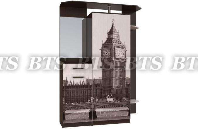 Мебель для прихожей Граф от производителя БТС мебель (в СПб). Малогабаритная мебель для вашего уютного и гостеприимного холла. Изысканный рисунок фотопечать Лондонский Биг-Бен на фасадных дверях. Данная модель задаст аристократический стиль вашей прихожей.| Код товара: | 36 |