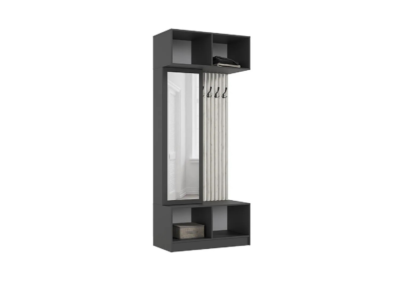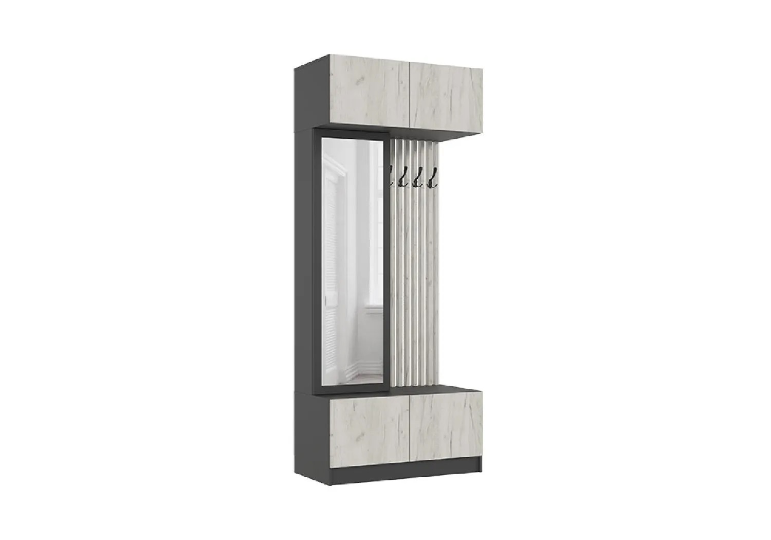 Модуль включает два вместительных отсека для хранения, а также секцию с уменьшенной глубиной, скрытую за зеркалом. Все створки открываются при помощи толкателей.