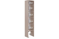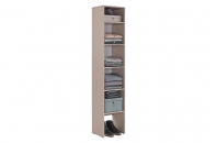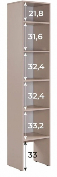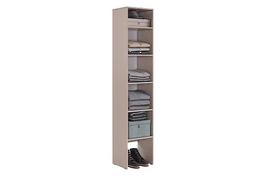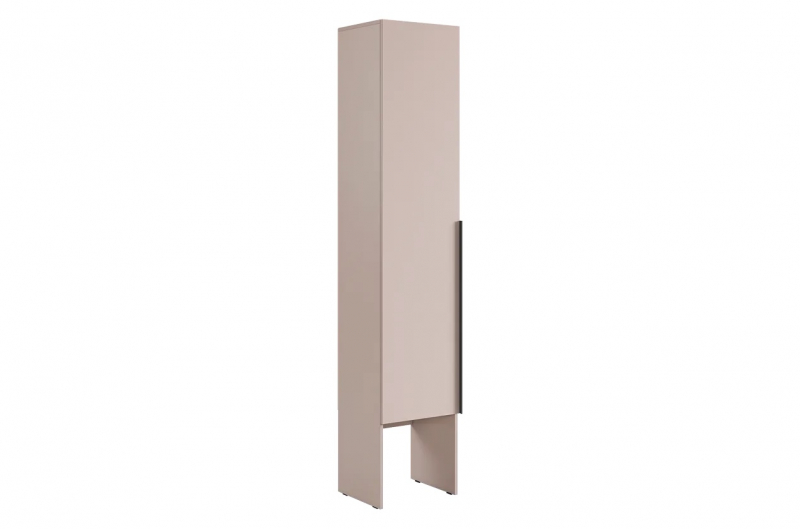 Шкаф оснащен одной распашной дверью, которая тихо закрывается благодаря доводчикам. Это обеспечивает плавное и мягкое закрывание, предотвращая случайное защемление пальцев. Внутри шкафа расположены пять полок, что позволяет хранить большое количество вещей.