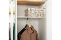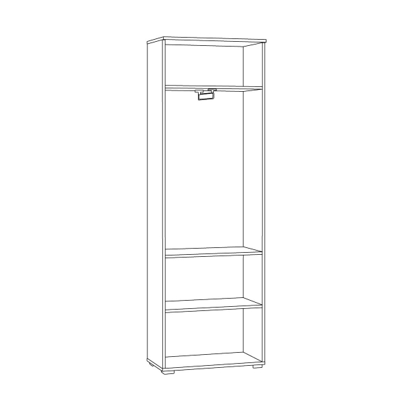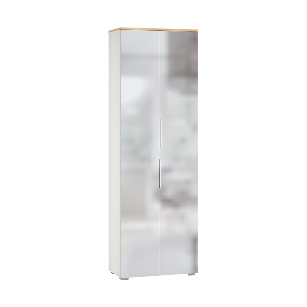 Двухдверный шкаф за распашными дверками которого расположены антресольная полка для головных уборов, выдвижная штанга для одежды на плечиках и две полки и ниша снизу. Зеркальные створки шкафа визуально расширяют пространство, а минималистичные алюминиевые ручки подчеркивают легкость и простоту линий. Максимальная нагрузка на каждую полку составляет 8 кг. Металлические ручки выполнены из алюминиевого профиля надежно крепятся и удобно ложатся в руку.