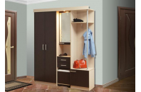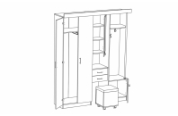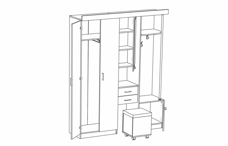 Это красивый, современный шкаф, способный стать практичным украшением любой прихожей. Он привлекает внимание превосходным функционалом, большим количеством отделений, полочек, оригинальным дизайном. С левой стороны имеется большой отдел с двумя распашными дверцами, справа – открытая секция с небольшой полкой и трубой-стойкой, которая опирается на ещё один отсек с распашной дверцей. В центре предусмотрены прямоугольное зеркало, ниша для хранения мелочей, два выдвижных ящичка и отсек для мягкого пуфа. Последний имеет четыре колёсика, с помощью которых можно передвигать пуф с одного места на другое.