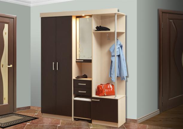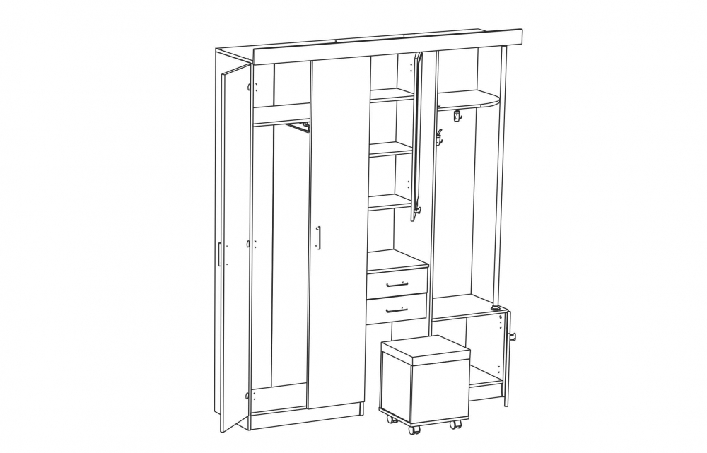 Это красивый, современный шкаф, способный стать практичным украшением любой прихожей. Он привлекает внимание превосходным функционалом, большим количеством отделений, полочек, оригинальным дизайном. С левой стороны имеется большой отдел с двумя распашными дверцами, справа – открытая секция с небольшой полкой и трубой-стойкой, которая опирается на ещё один отсек с распашной дверцей. В центре предусмотрены прямоугольное зеркало, ниша для хранения мелочей, два выдвижных ящичка и отсек для мягкого пуфа. Последний имеет четыре колёсика, с помощью которых можно передвигать пуф с одного места на другое.