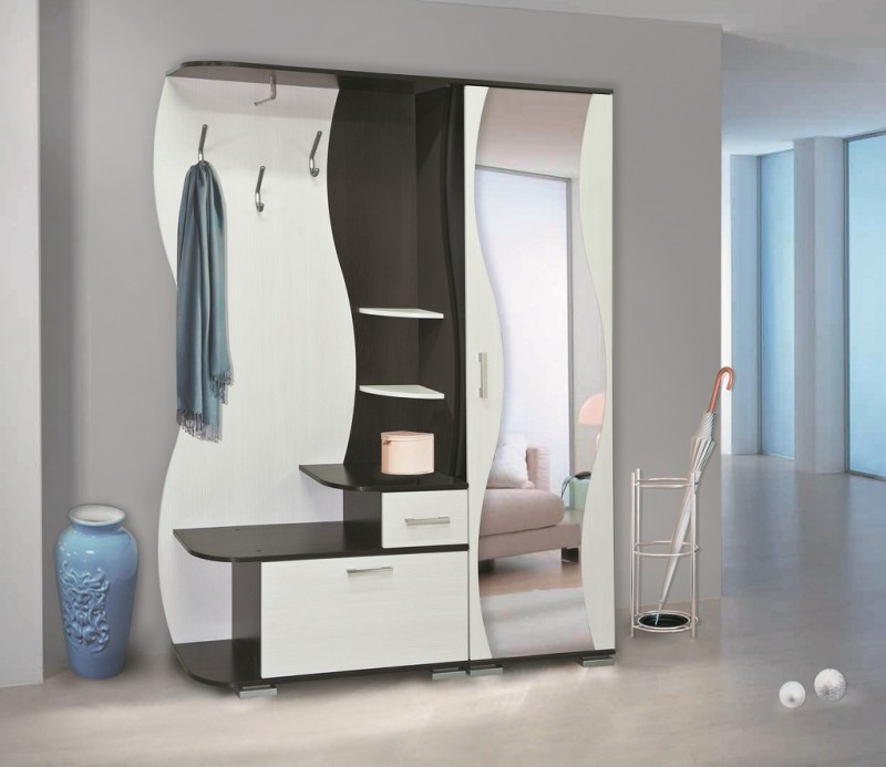 Открытая вешалка с тремя 2-рожковыми крючками для одежды. Открытые полки для сумок и мелочей, один выдвижной ящик и секция для обуви с полкой внутри и откидной дверью. Модель установлена на пластиковые опоры.