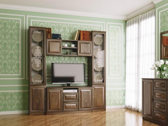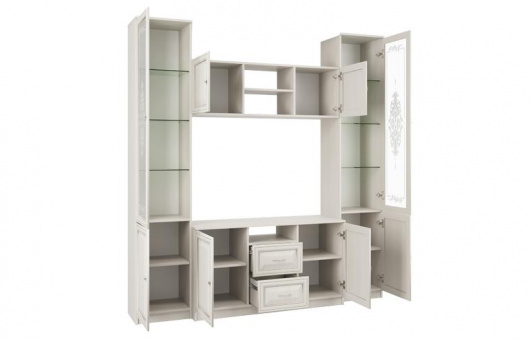 Элегантная стенка Габриэлла 06.87 поможет со вкусом обустроить уютную комнату, где вы сможете проводить свободное время, собираться семьей и принимать близких друзей. Специальная тумба поможет разместить телевизор на уровне глаз для комфортного просмотра, а необходимую аппаратуру можно разместить в открытой нише. На навесной полке будут отлично смотреться яркие семейные фотографии, вазоны с красивыми цветами, сувениры и оригинальные предметы декора. Шкафы-витрины позволят красиво и изящной расположить наборы посуды, интересные книги, фотоальбомы и другие ценные для вас вещи.