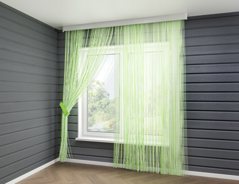 Шторы представляют собой множество тонких нитей, закрепленных на широкой ленте. Нити создают интересный струящийся эффект. Такие шторы можно использовать для оформления окон, дверных проемов и для зонирования комнаты. Ухаживать за веревочными шторами совсем не сложно. Они легко стираются, быстро сохнут, сохраняют первоначальный внешний вид продолжительное время.