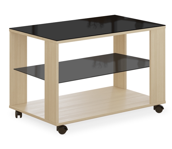 Очаровательная и удобная модель журнального стола обладает хорошей вместительностью. Широкая прямоугольная столешница, декорированная черным стеклом лакобель, подходит для работы и чаепития с гостями. Под основной столешницей располагается стеклянная полка для хранения газет, журналов и других предметов. Нижняя панель служит дополни- тельной полкой. Журнальный стол выполнен из практичной ЛДСП, торцы обклеены кромкой ПВХ. Изделие − крепкое и надежное. Благодаря наличию колесиков, стол легко перемещается.