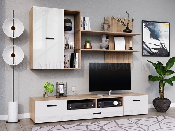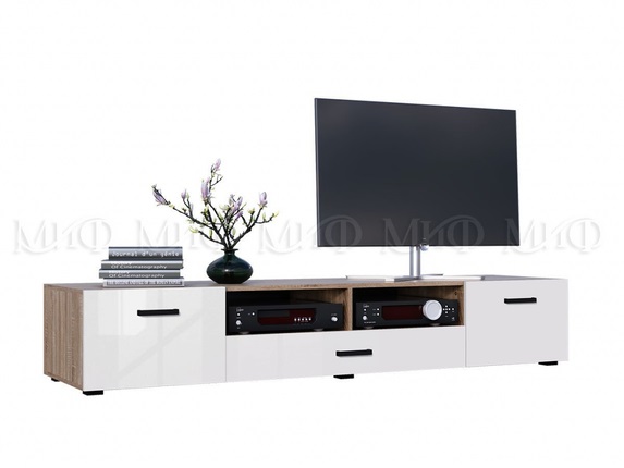 Тумба ТВ Нэнси New - стильная телевизионная тумба с двумя нишами и выдвижным ящиком под ними, и с двумя боковыми отделениями для хранения за распашными дверцами. В основании тумбы - низкие квадратные опоры.
