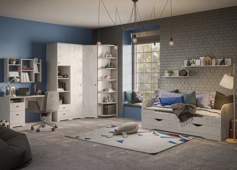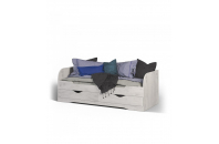 Односпальные кровати для детской спальни, которые не нужно раскладывать для сна. Головной щит и детали кровати, которые в эксплуатации подвержены механическим повреждениям, облицованы кромкой ПВХ толщиной 2 мм.  Основание щитовое, в основании установлены два выдвижных ящика для хранения постельного белья.
