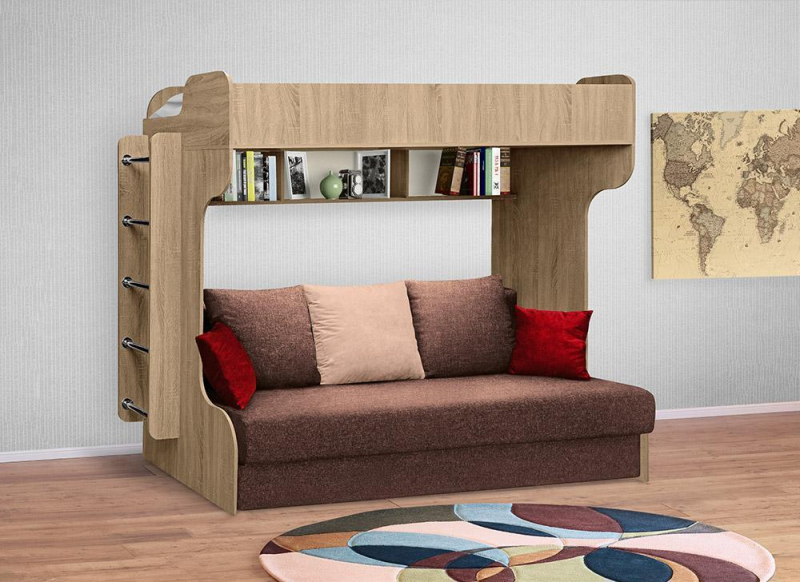 Комфортабельная и многофункциональная двухъярусная кровать для детской комнаты. Такое изделие включает в себя несколько элементов, что позволит сэкономить на покупке дополнительной мебели.Сверху находится одноместная кровать с бортиками, которые предотвращают падение с высоты. Взобраться на второй ярус поможет лесенка. Она монтируется либо с левой либо с правой стороны.Внизу располагается диван на основе пружинного блока (540 пружин), который можно разложить, и тогда получится три полноценных спальных места.