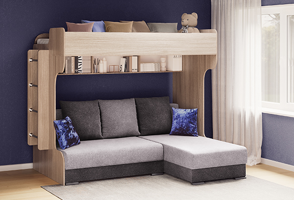 Кровать двухъярусная Элиза Голд угловая - это оптимальный вариант для небольшой детской комнаты.Благодаря тому, что кровать комплектуется угловым диваном, она имеет три спальных места. Одно из них расположено на втором ярусе. Для безопасности спальное место оборудовано защитными бортами. Лестница для подъема на второй ярус удобная и полностью безопасная. На каждой ее перекладине находится противоскользящая накладка, что исключает возможность падения. Лестница может крепиться как с правой, так и с левой стороны кровати, что снимает ограничения по расположению мебели в комнате.На нижнем ярусе расположен угловой диван с удобным механизмом трасформации "Еврокнижка", с помощью которого открывается доступ к широкому спальному месту. Угол у дивана универсальный и может располагаться как с левой, так и справой стороны.