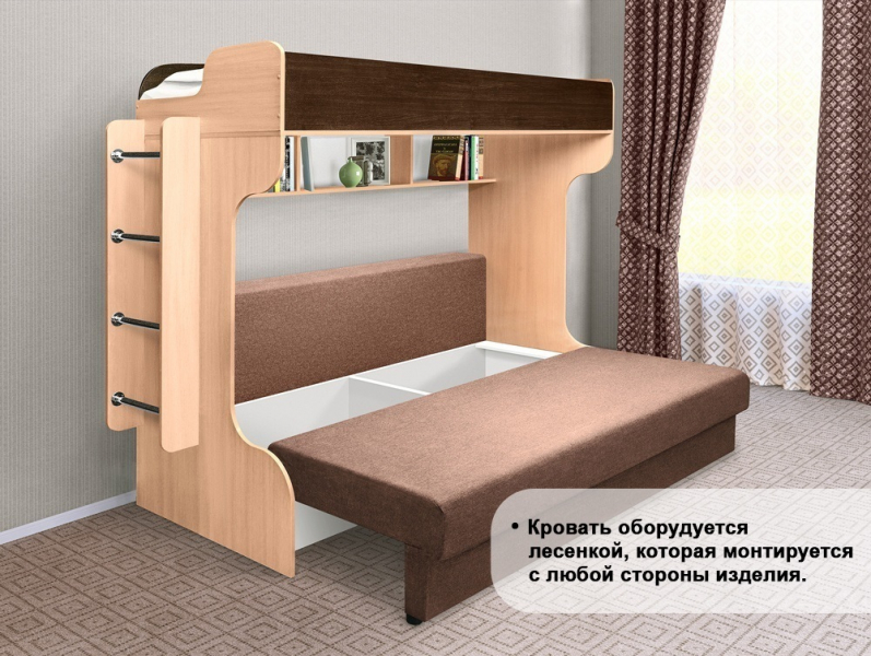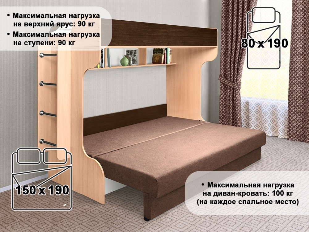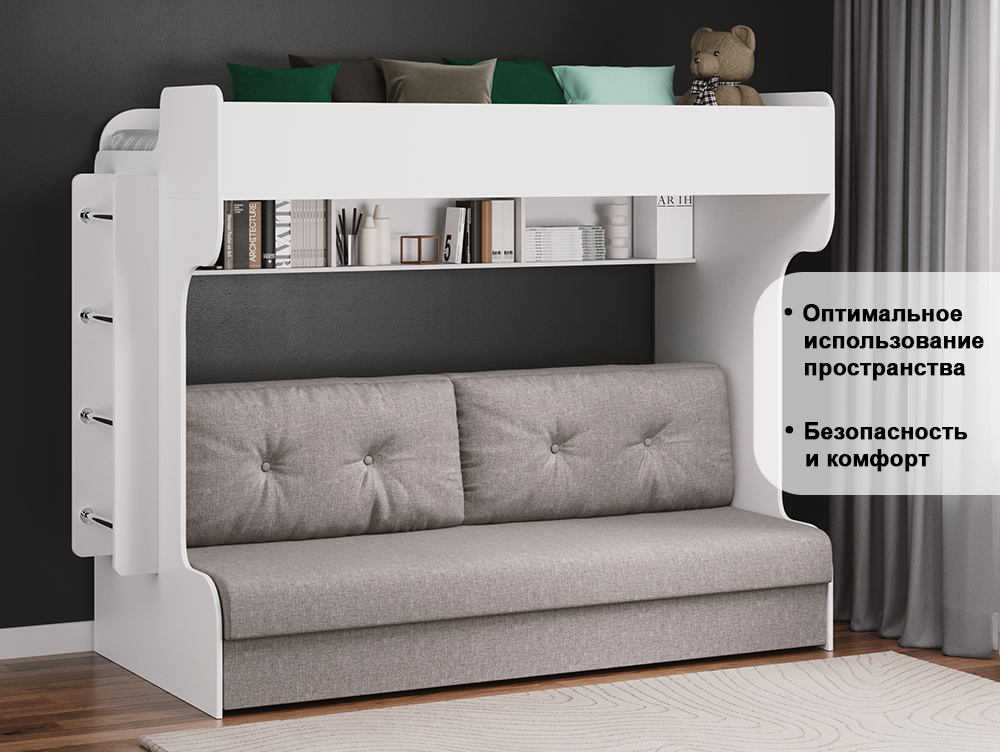 Нижний ярус в собранном виде представляет собой диван, на котором удобно отдыхать, читать или играть. Диван легко раскладывается, превращаясь в удобное спальное место. В основании дивана расположен блок независимых пружин (540 пружин), который гарантирует максимально комфортный сон.