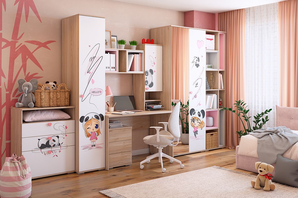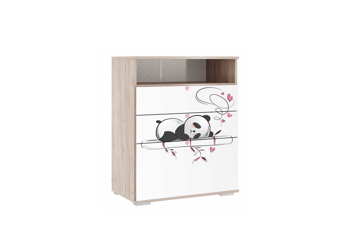Стильный и модный комод «Панда». В комоде много ящиков в которые вы сможете разместить вещи. Ящики выкатные с доводчиками, обеспечат бесшумное закрывание фасадов. Модный и стильный рисунок на фасадах, придаст индивидуальность детской комнате, а тактильно приятные ручки-сердечки, очаруют каждую девочку. Принтерный рисунок устойчив к истиранию и ультрафиолету.