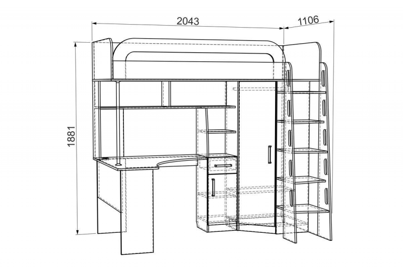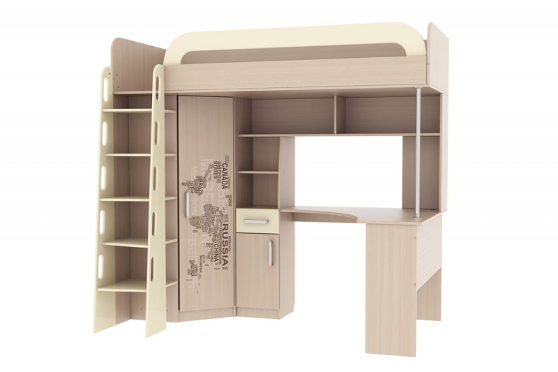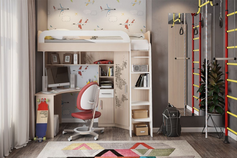 «Мультиплекс» - это супер-комплект для жизни и учебы ребенка! В нем есть большой стол, шкаф для одежды, полки и место для сна. Всё это в одном изделии! Он компактно располагается в комнате.