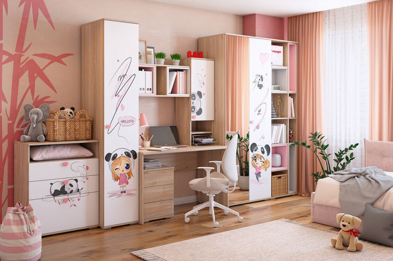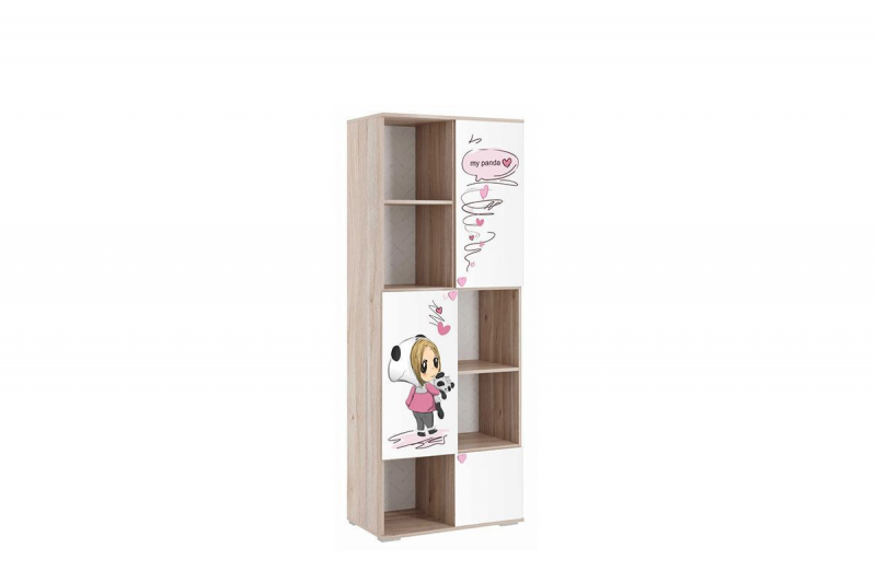 Стильный и модный стеллаж «Панда» позволяет разместить множество вещей на открытых и закрытых секциях. Модный и стильный рисунок на фасаде, придаст индивидуальность детской комнате, а тактильно приятные ручки-сердечки, очаруют каждую девочку. Принтерный рисунок устойчив к истиранию и ультрафиолету.